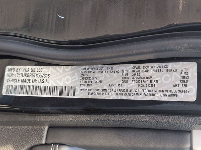 Diamond Black Crystal Pearlcoat 2026 Jeep Grand Cherokee L Limited 4WD 8-Speed Automatic 2.0L I4 PDI Turbocharged DOHC 16V LEV3-SULEV30 324hp Bluetooth®, 10 Speakers, 4-Wheel Disc Brakes, ABS brakes, Active Noise Control System, Air Conditioning, AM/FM radio: SiriusXM with 360L, Anti-whiplash front head restraints, Apple CarPlay, AppLink/Apple CarPlay and Android Auto, Audio memory, Auto High-beam Headlights, Automatic temperature control, Brake assist, Capri Leatherette Seats, Compass, Delay-off headlights, Delete Limited Badge, Disassociated Touchscreen Display, Driver door bin, Dual front impact airbags, Dual front side impact airbags, Dual-Pane Panoramic Sunroof, Electronic Stability Control, Emergency communication system, Exterior Accents Dark Neutral Metallic, Four wheel independent suspension, Front anti-roll bar, Front dual zone A/C, Front fog lights, Fully automatic headlights, Garage door transmitter, Google Android Auto, GPS Antenna Input, Heated front seats, Heated rear seats, Heated steering wheel, Illuminated entry, Integrated Center Stack Radio, Interior Rear Facing Camera, Knee airbag, Limited Altitude Package, Low tire pressure warning, Memory seat, Navigation System, Normal Duty Suspension, Occupant sensing airbag, Overhead airbag, Panic alarm, ParkView Rear Back-Up Camera, Power driver seat, Power Liftgate, Power steering, Power windows, Quick Order Package 2CE Limited, Radio data system, Radio: Uconnect 5 Nav with 12.3 Display, Rear air conditioning, Rear window defroster, Remote keyless entry, Security system, Steering wheel mounted audio controls, Wheels: 20 x 8.5 Gloss Black Painted Aluminum.