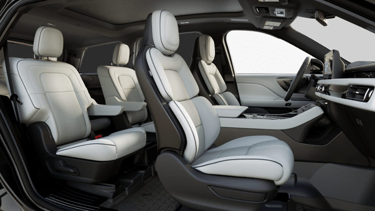 Backup Camera, Aviator Black Label, 3.0L V6, AWD, Black Metallic, Green Moonbeam Leather, 28 Speakers, 30-Way Perfect Position Seats w/Active Motion, 3rd row seats: split-bench, Adaptive suspension, Air Glide Suspension w/Dynamic Lower Entry, All-Weather 1st & 2nd Row Floor Liners (16A), Apple CarPlay/Android Auto, Auto High-beam Headlights, Auto-dimming Rear-View mirror, Black Exterior Elements, Body-Color Exterior Elements, Driver door bin, Driver vanity mirror, Dynamic Handling Package, Equipment Group 800A, Exterior Parking Camera Rear, Front reading lights, Fully automatic headlights, Garage door transmitter, Genuine wood console insert, Genuine woodgrain Interior Accents, Head restraints memory, Heads-Up Display, Heated front seats, Heated rear seats, Heated steering wheel, Illuminated entry, Jet Appearance Package, Lincoln Digital Experience, Memory seat, Overhead console, Passenger vanity mirror, Power Liftgate, Power moonroof: Panoramic Vista Roof, Radio: Revel Ultima 3D Audio System w/28 Speakers, Rain sensing wipers, Rear window defroster, Rear window wiper, Remote keyless entry, SiriusXM, Speed-Sensitive Wipers, Steering wheel memory, Telescoping steering wheel, Tilt steering wheel, Variably intermittent wipers, Ventilated front seats, Ventilated rear seats, Voice Activated Navigation System, Wheels: 22 Ebony Black Bright-Machined.