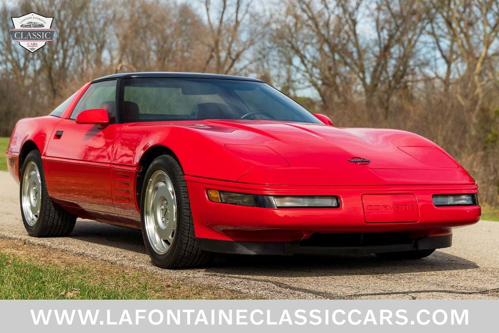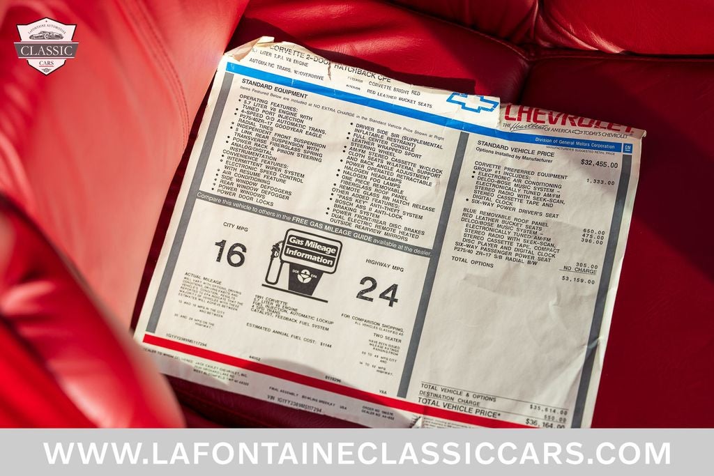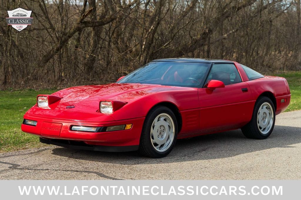 This 1991 Corvette was sold new at Jack Cauley Chevrolet of West Bloomfield MI and remained with the original owner all this time, never driven in inclement weather, non-smoker, and only serviced at the Chevrolet Dealer! Finished in Bright Red over a Red Leather interior and Powered by a 5.7-liter LT1 V8 paired with a 4-Speed Automatic Transmission! Equipment includes, factory 17 alloy wheels still wrapped in the original Goodyear tires Handling Package, Heavy Duty Brake system, Delco Bose Gold Series Music system with CD & Cassette, 6-way Power Adjustable Seats, Removable Glass Roof, and quad exhaust tips! The car has been kept in stock factory condition and was always stored in a climate controlled garage. This Vette is now offered with both sets of keys, Original owners manual, Service records, Window sticker, Chevrolet Cassette Tape, Dealer literature and a clean title.
